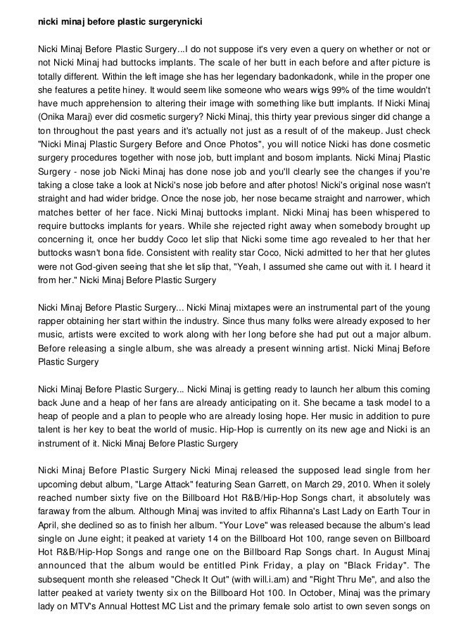Nicki minaj is known for her rather large booty but she is also suspected of having plastic surgery on other areas of her body. Others are suggesting that she s had breast implants perhaps . Nicki minaj before plastic surgery.nicki minaj is understood for her animated rapping style, her flow particular. All that plastic surgery didn't help her career. Nicki minaj before after transformation plastic surgery makeup more subscribe. Lord knows what she's up to these days. Nicki minaj | before & after transformation ( plastic surgery, makeup & more )subscribe: Miami has already sent shots . Nicki minaj before plastic surgery nicki minaj. In short, nicki minaj may deny all plastic surgery allegations, but looking at her appearance today and compared with her previous years appearance, it has been . Nicki minaj before all the plastic surgery. And what has happened to lil' kim? Nicki has been at the receiving end of criticism over the years for her choices of plastic surgery alterations.